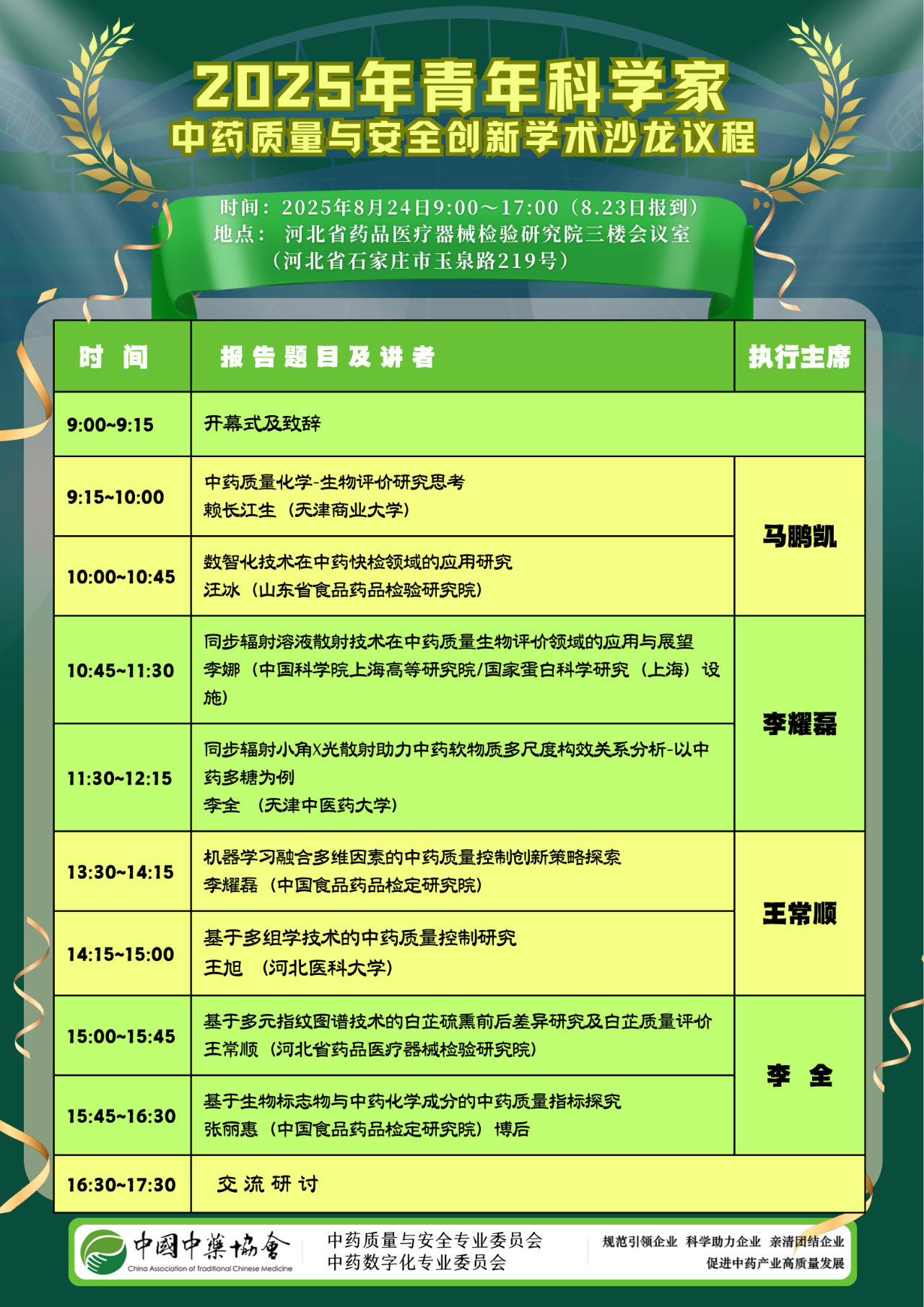 为扶持优秀青年科技工作者学术成长、培养学术带头人和科技领军人才,搭建学术交流平台,推动青年科技工作者拓宽学术视野,中国中药协会中药质量与安全专业委员会联合中药数字化专委会将以“中药质控技术的现代化及其应用”为主题,共同组织召开“2025年青年科学家中药质量与安全创新学术沙龙”。具体通知如下: