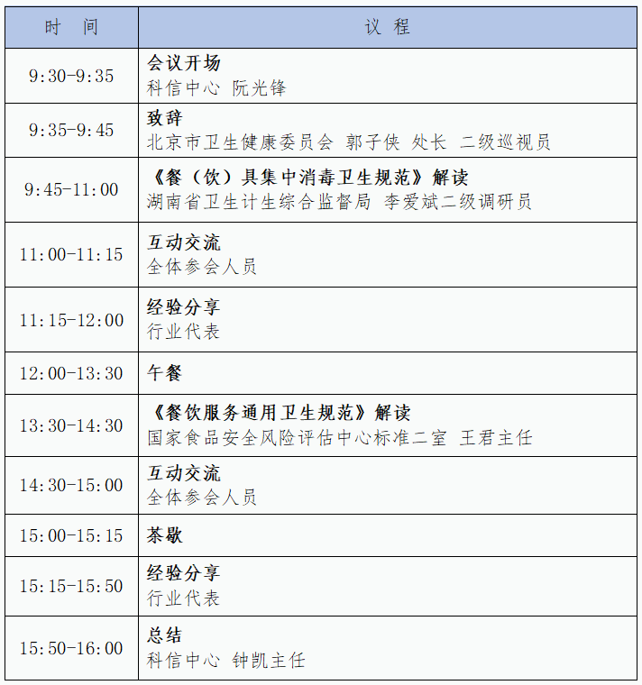 近日,《食品安全国家标准 餐(饮)具集中消毒卫生规范》和《食品安全国家标准 餐饮服务通用卫生规范》发布。为帮助标准使用人员了解该系列标准的制修订思路,提高执法水平,助力餐饮企业保障食品安全,受北京市卫生健康委员会委托,科信食品与健康信息交流中心拟召开2021年北京市卫生健康委食品安全标准大课堂(第一期)“餐饮标准”宣贯会。现将具体事宜安排如下: