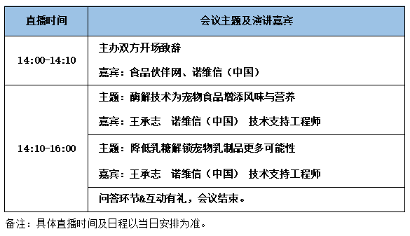 基于酶解技术的优势及在宠物食品中的广泛应用,食品伙伴网联合诺维信(中国)将于2022年1月13日以线上直播的形式举办一场“酶解技术为宠物食品增添风味与营养”技术研讨会,会议将邀请诺维信(中国)的资深技术支持专家为大家解析酶如何在宠物食品发挥它的强大功能,并为大家阐述诺维信在酶制剂应用方面的解决方案!