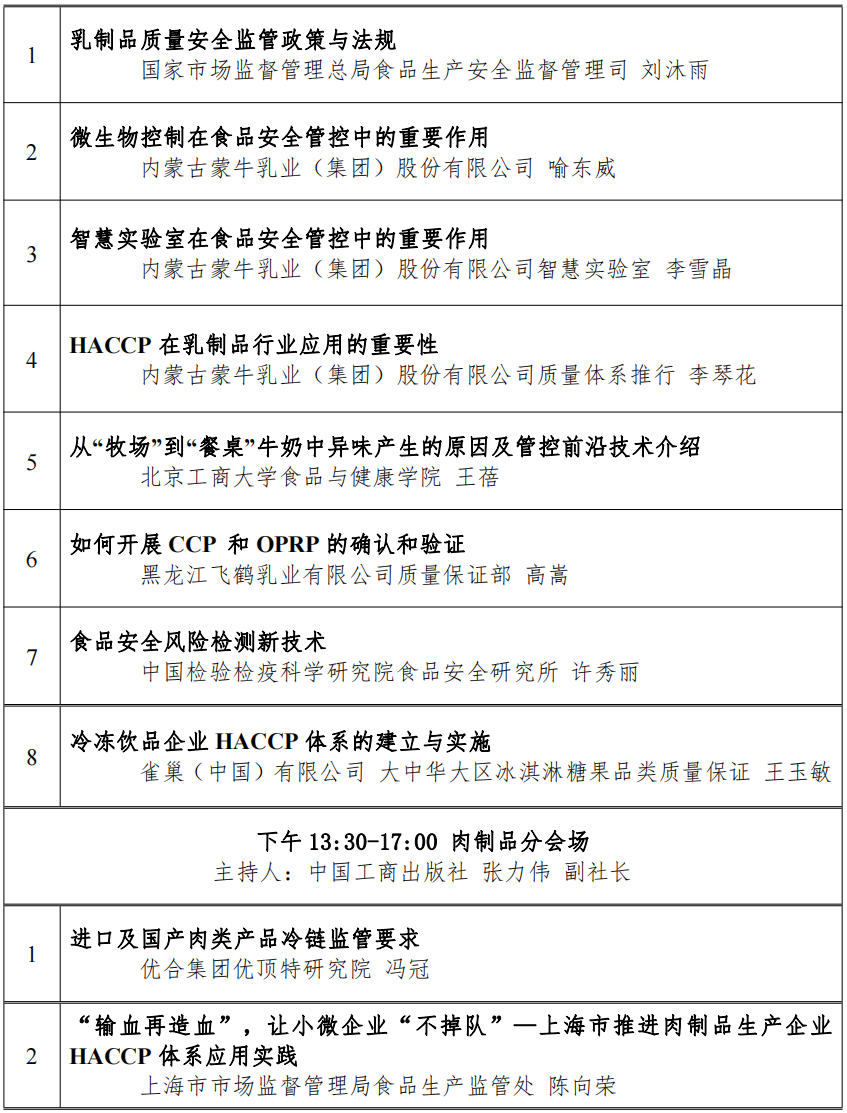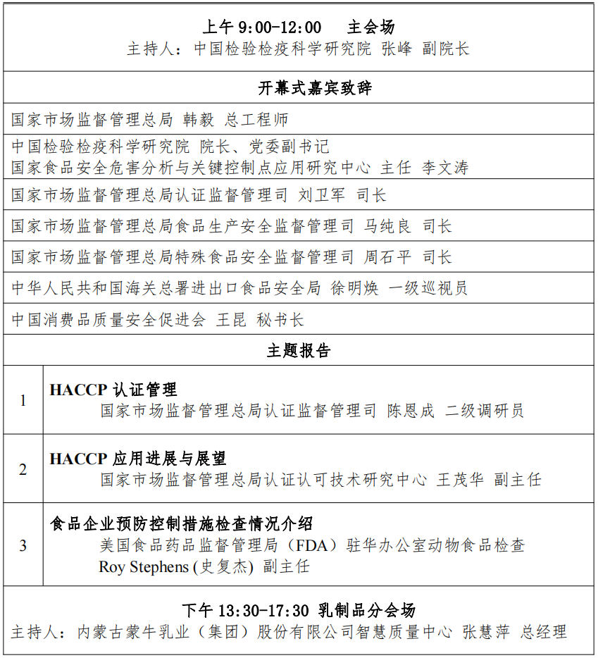 本届 HACCP 研讨会主要由开幕式、主题报告、专题报告(3 个专题)组成。拟邀请相关政府监管部门、知名专家学者做精彩演讲,组织市场监管人员、HACCP 认证机构审核员、评定人员、食品生产企业从业人员、有关科研单位和院校研究人员等共同参会研讨。